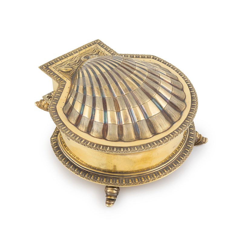 An Edwardian silver-gilt inkwell,by R & S Garrard & Co, London 1901, scallop shell form, to the