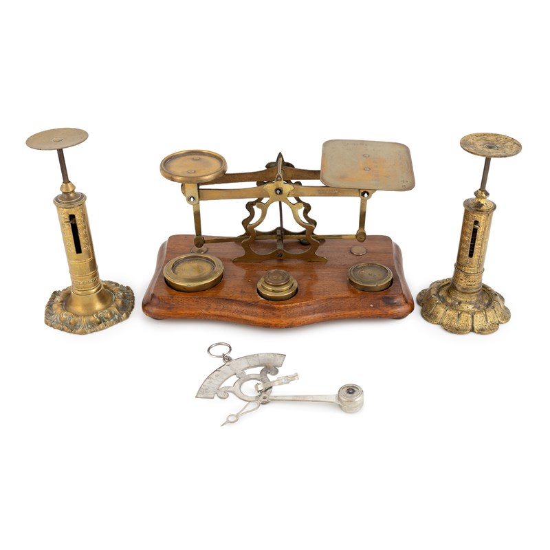 wirework scale frame, five weights, on a shaped rectangular form, plus two gilt metal Victorian letter scales by RW Winfield, candlestick form with shaped foliate and scroll bases, and an electroplated hook letter scale. (4)
