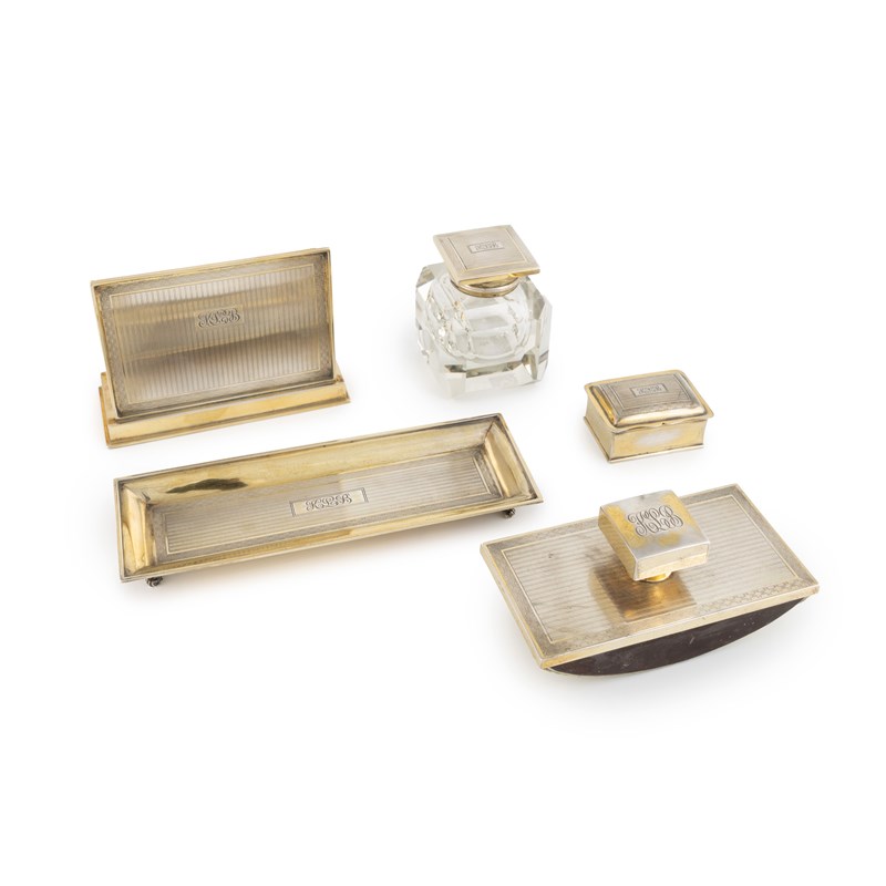 A Canadian silver-gilt five-piece desk set, by Henry Birks & Sons, Quebec 1937, engine-turned