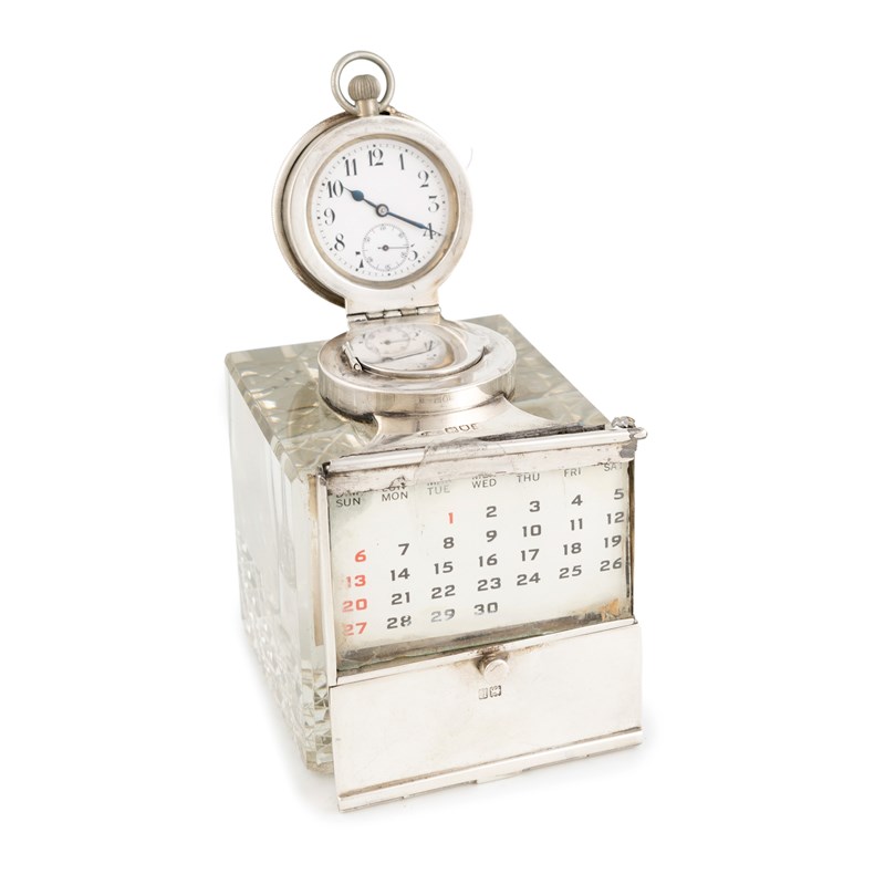 An Edwardian silver-mounted inkwell, stamp holder and pocket watch,