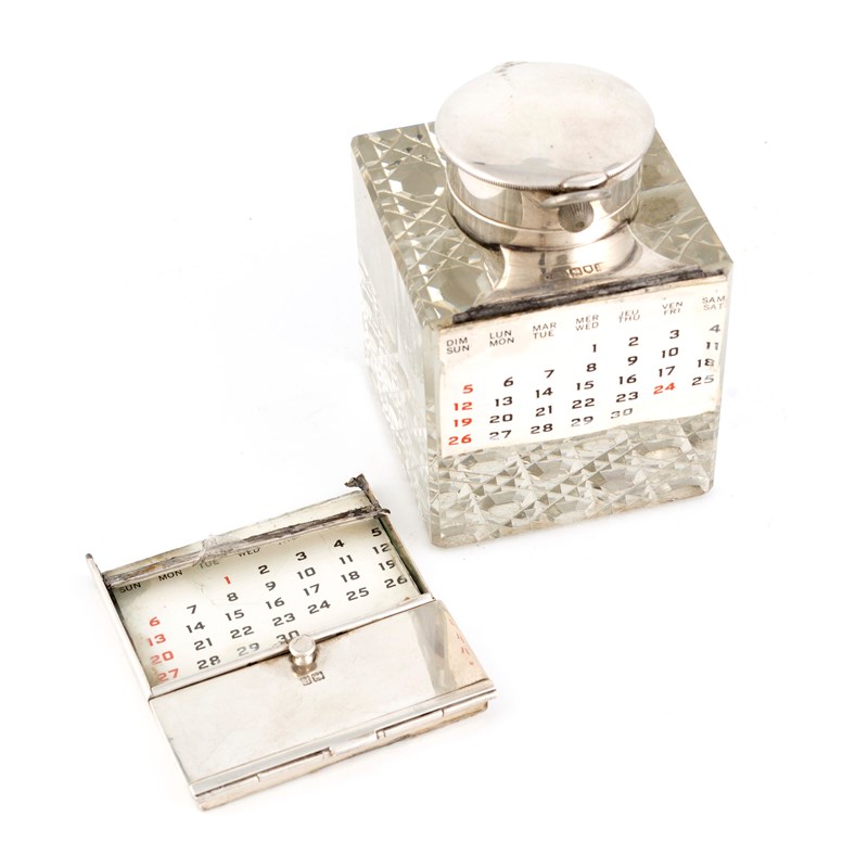 square-form, the front with a hinged stamped compartment and calendar (a.f), the hinged cover with a pocket watch to the underside, height 10.3cm.