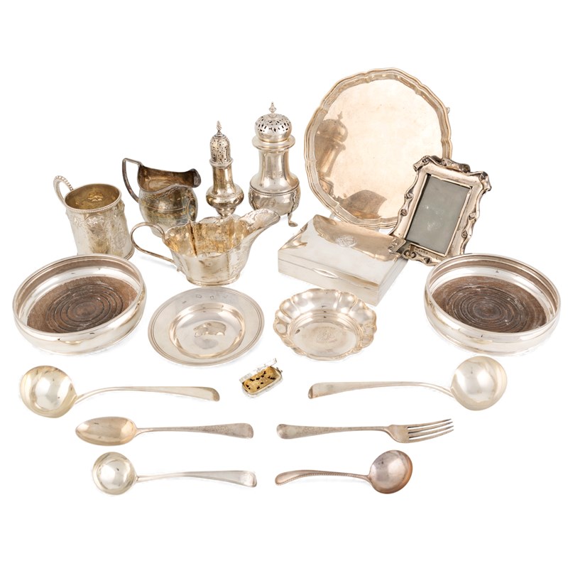 comprising: a Victorian christening mug, a pepper pot, a caster, a pair of wine coasters, a photograph frame, a waiter, a cigarette box, four sauce ladles, a dessert spoon and fork, a cream jug, a sauce boat, a vinaigrette, a small dish and an armada dish, total approx. weighable 45.9oz. (qty)