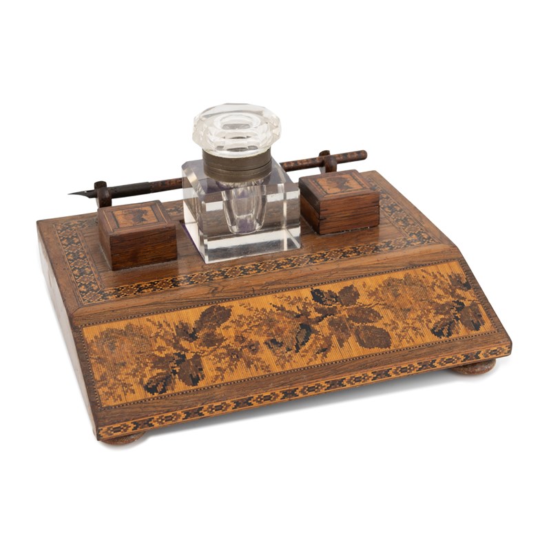 A late-19th century Tunbridge ware inkstand and dip pen,