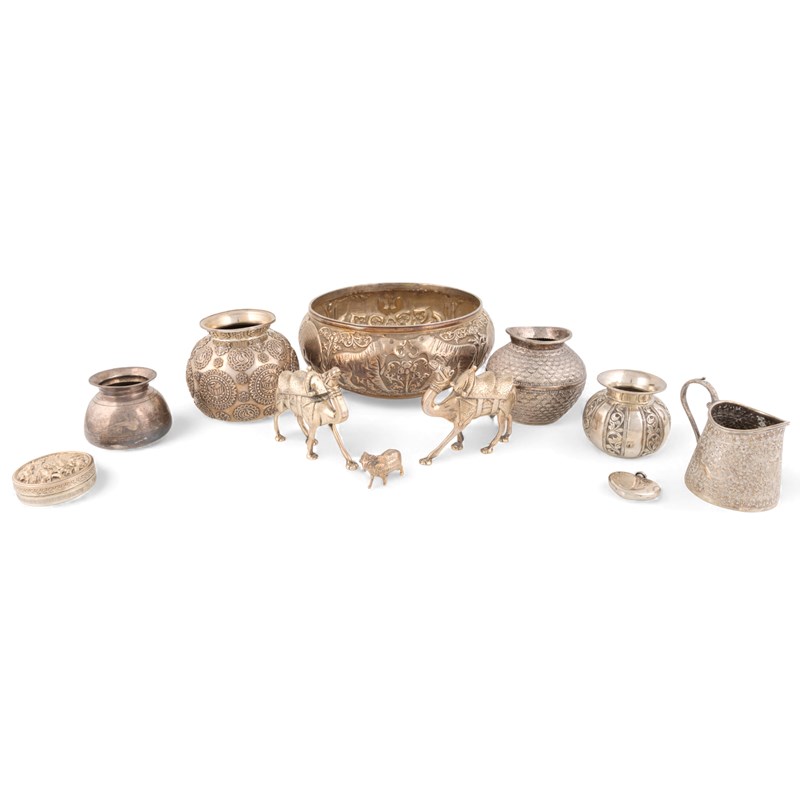comprising: an Indian silver cream jug, a large bowl, four pots, a scent bottle, two camels, a goat and a small circular box, total approx. weighable 65.1oz. (qty)