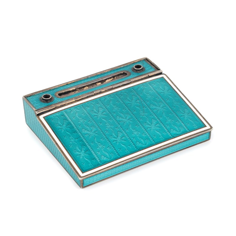 modelled as a desk stand, decorated with turquoise enamel with a white border and engine-turned decoration to the underside, the hinged cover reveals three gilded compartments, length 7.8cm, approx. weight 5.5oz.
