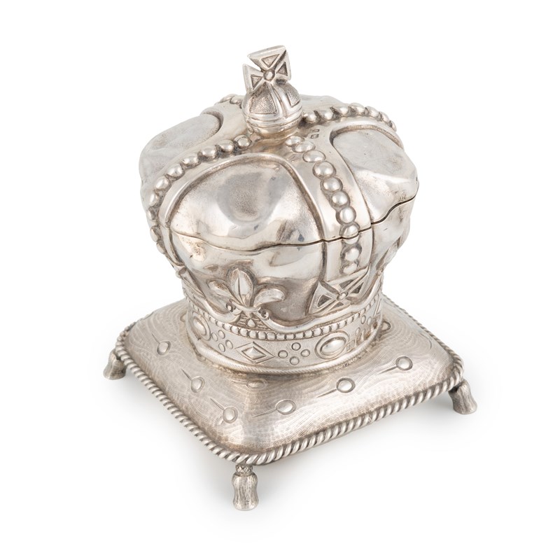 A novelty Edwardian silver inkwell, by Thomas Ducrow, Birmingham 1901, modelled as a crown on a