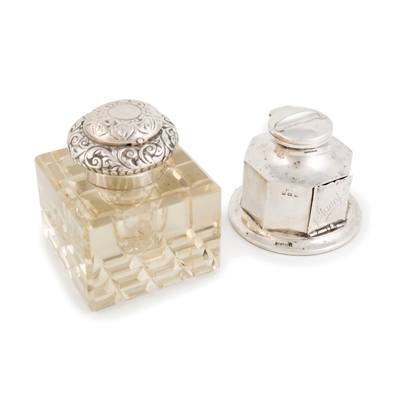 square form with a cut glass base, the mount embossed with foliate decoration, to the top of the hinged cover is a hinged stamp compartment, length 7.6cm, plus a silver inkwell, maker's mark worn, Birmingham 1912. (2)