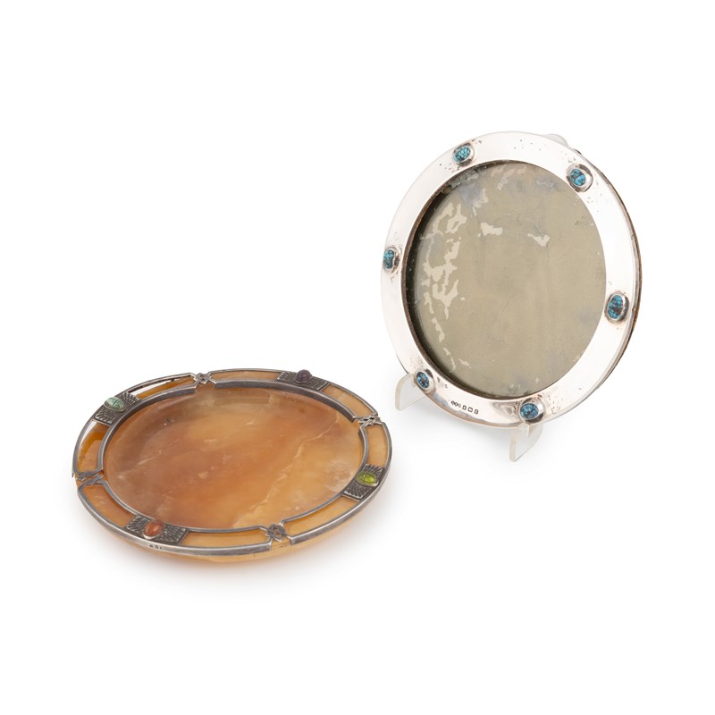 circular form set with turquoise cabochons, plus an early-20th century Austrian silver-mounted alabaster dish with Egyptian-style decoration (a.f), diameter 13.4cm. (2)