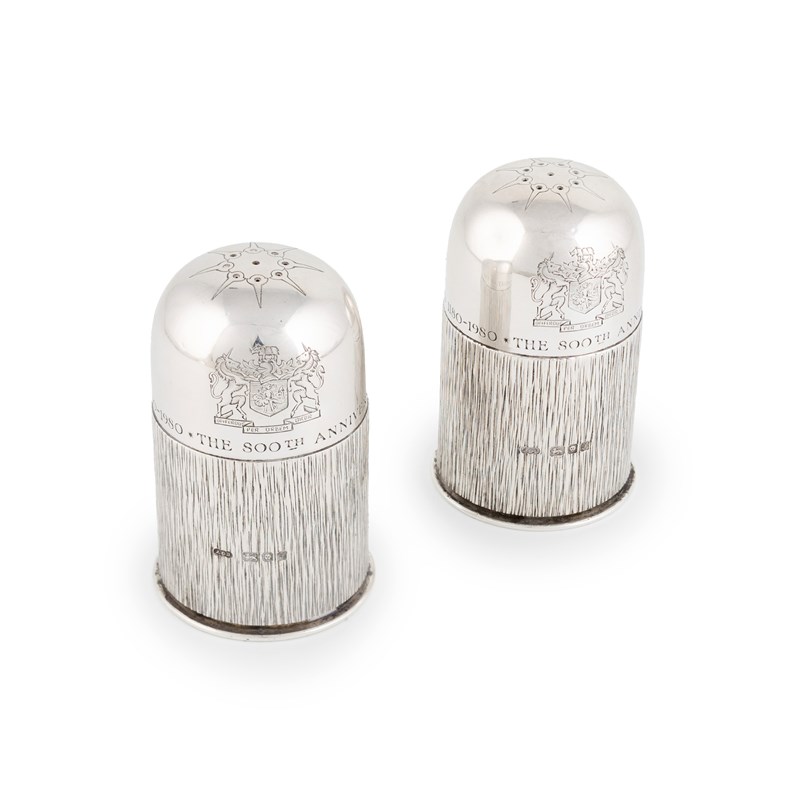 cylindrical form with textured decoration, engraved armorial and inscribed 'The 800th Anniversary of the Pepperers Guild 1180-1980', height 7cm, total approx. weight 5.4oz. (2)