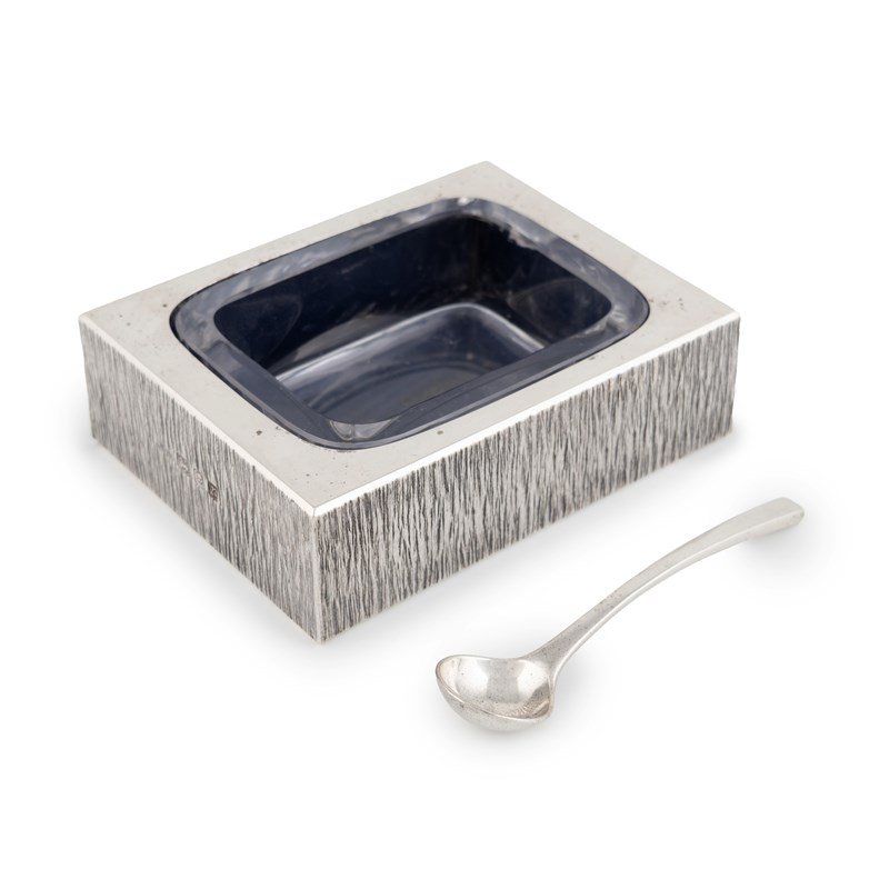 By Gerald Benney, a modern silver desk tidy and salt spoon, London 1960 and 1972, rectangular form