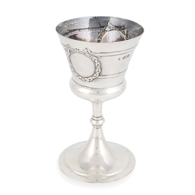 urn form with two vacant wreath cartouches, knopped stem on a raised circular foot, height 19.6cm, approx. weight 10.9oz.