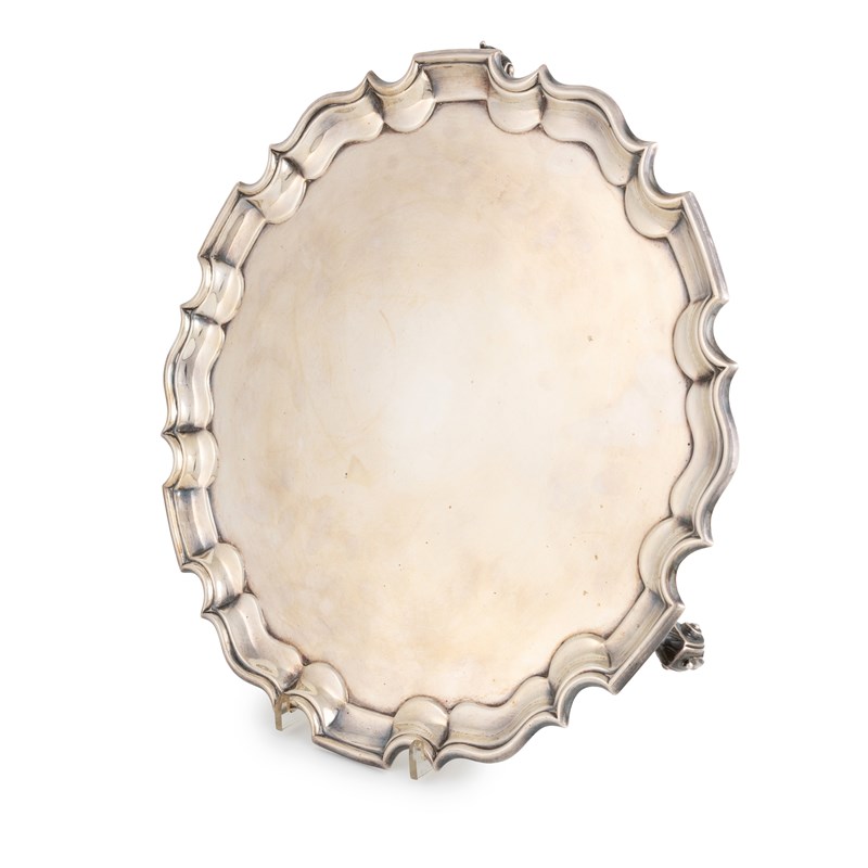 shaped circular form, moulded border, a later inscription to the reverse, on three gnarl feet, diameter 35.5cm, approx. weight 37.2oz.