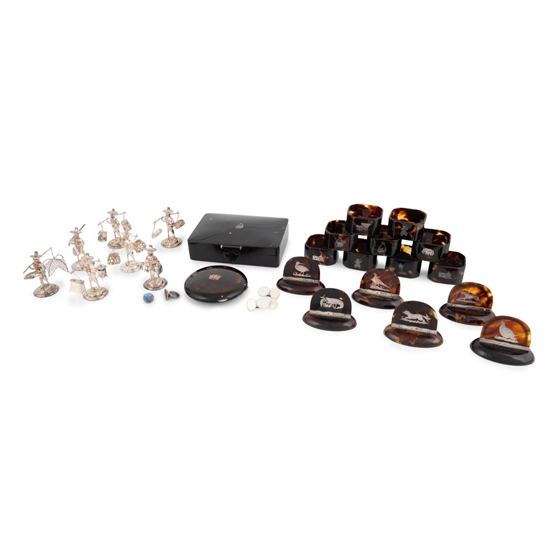 oval form, set with birds, a dog, a fox and a lobster, plus a set of nine silver-mounted tortoiseshell napkin rings, a silver-mounted tortoiseshell box (a.f), a gold-mounted tortoiseshell compact and seven Chinese export silver figures, total approx. weighable 2.6oz. (qty)