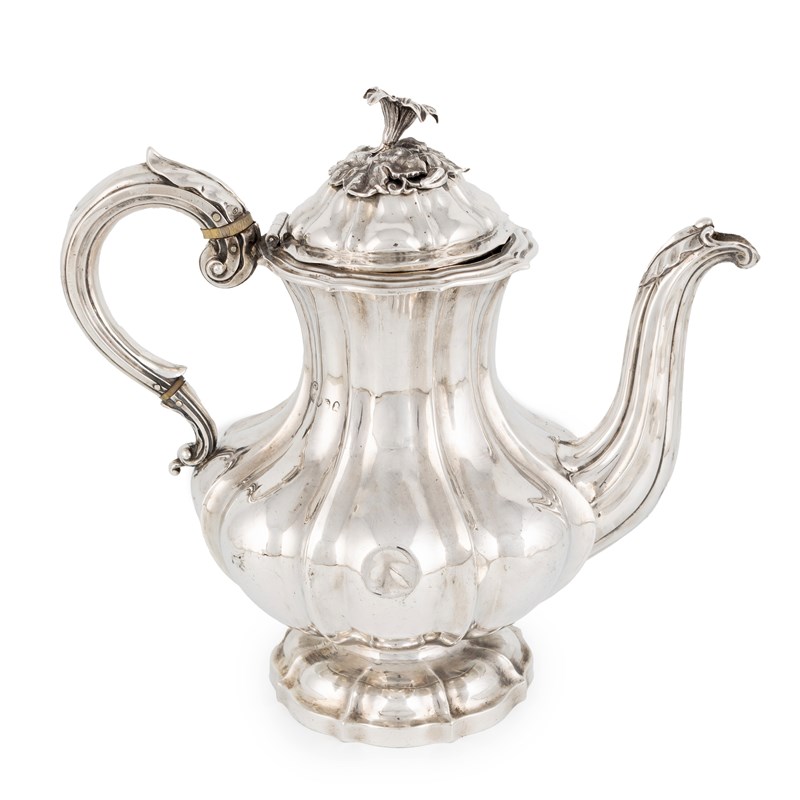 λ A William IV silver coffee pot, by Charles Fox, London 1832, lobed baluster form, hinged domed
