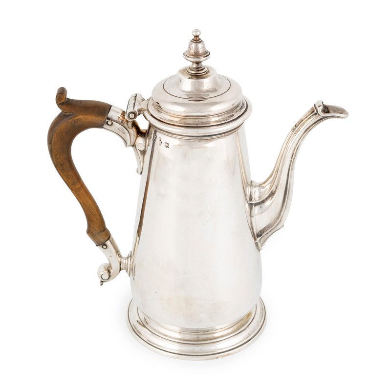 A George II silver coffee pot, by Aymé Videau, London 1750, tapering circular form, hinged cover
