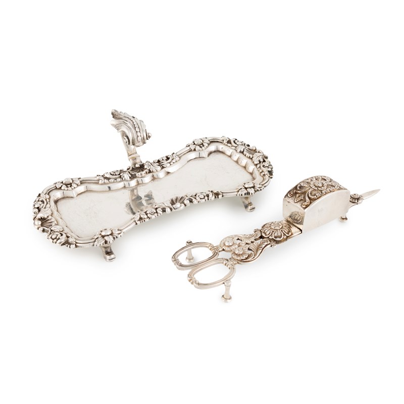 scissor form with scroll foliate decoration, the tray of shaped oblong form with a moulded shell and foliate border, acanthus leaf-capped handle on four pad feet, length 20.5cm, total approx. weight 15.8oz. (2)
