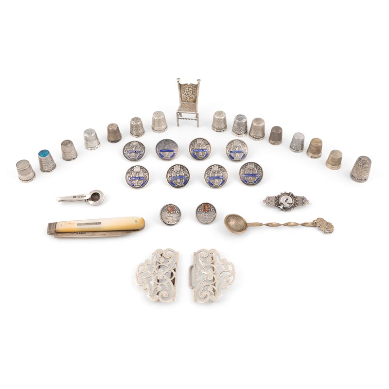 comprising: an Edwardian silver belt buckle by Adie & Lovekin Ltd., Birmingham 1902, fifteen thimbles, a small chair, a napkin clip, a badge, a mother-of-pearl handled fruit knife, a South African coin salt spoon and ten silver and enamel buttons, total approx. weighable 5.3oz. (qty)