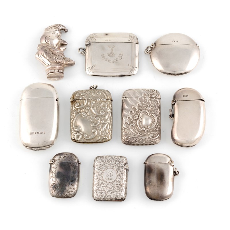 comprising: one by Mappin & Webb, Birmingham 1911, one by Howard James, Birmingham 1884, engraved with a presentation inscription, one by Patterson & Sons Ltd, Birmingham 1911, one by Constantine & Floyd, Birmingham 1894, one by James Deakin & Sons, Chester 1901, a continental one modelled as Mr Punch, plus four other vesta cases, total approx. weight 7.8oz. (10)
