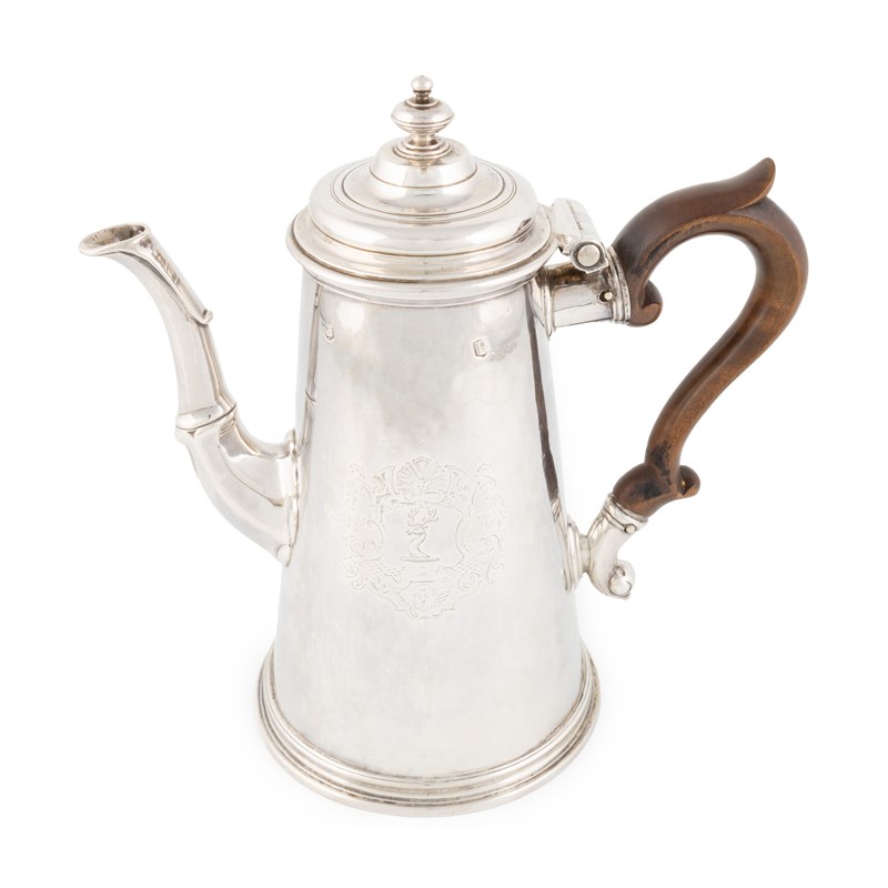A George II silver coffee pot,by William Shaw, London 1730,tapering circular form, faceted spout,