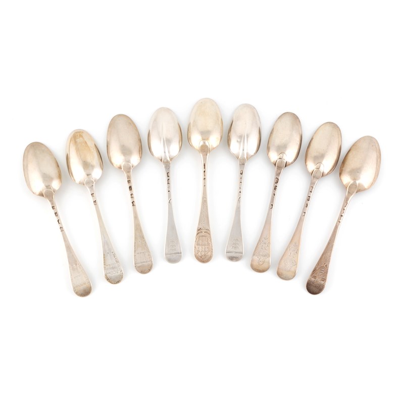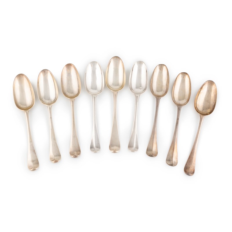 A collection of nine 18th century silver Hanoverian pattern tablespoons,