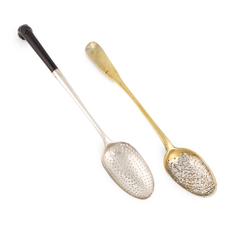 the oval bowl with plain piercing and engraved with a widow's lozenge, tapering handle with a wooden terminal, length 32cm, plus an 18th century silvered brass straining spoon, circa 1760, the oval bowl with pierced decoration, length 29.3cm. (2)