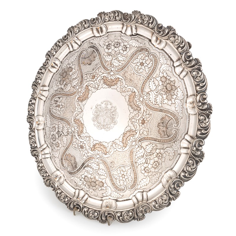 circular form, chased foliate scroll decoration, foliate scroll border, the centre engraved with an armorial within scroll mantling, on four foliate bracket feet, diameter 49cm.