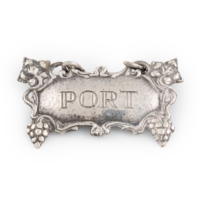 shaped rectangular form with a stylised grape and vine border and spot-hammered decoration, incised 'Port', length 4.6cm, approx. weight 0.4oz.