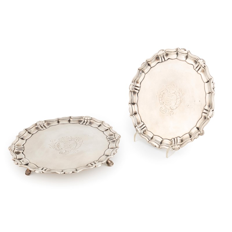 circular form, shell and scroll border, the centre with the arms of Hull within foliate scroll mantling, on three hoof feet, the reverse of one inscribed 'Corporation Waiter', the reverse of the other inscribed 'The waiters purchased by John Wray at the Sale of the Plate of the Corporation of Hull, in memory of the many members of his Family who during a period of more than a century had at different times served the Office of Mayor, Recorder and Sheriff', diameters 15.9cm and 16.1cm, approx. weight 15oz. (2)