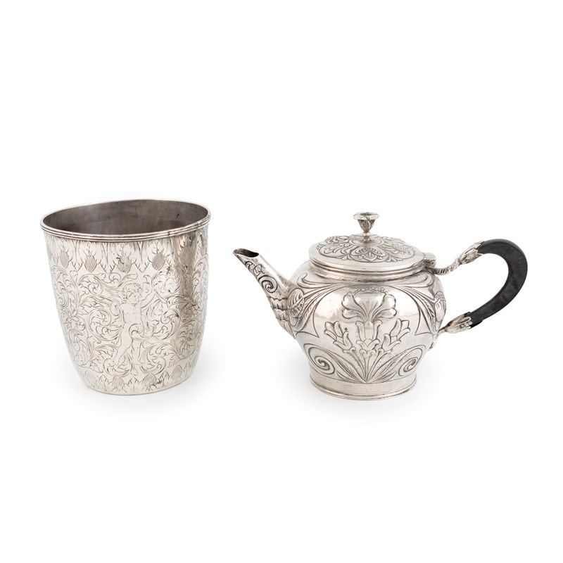 circular form, embossed foliate decoration, scroll handle, the hinged cover with a flower finial, length 15cm, plus a continental silver beaker, of tapering circular form, engraved foliate decoration, height 8.8cm, approx. total weight 8.3oz. (2)