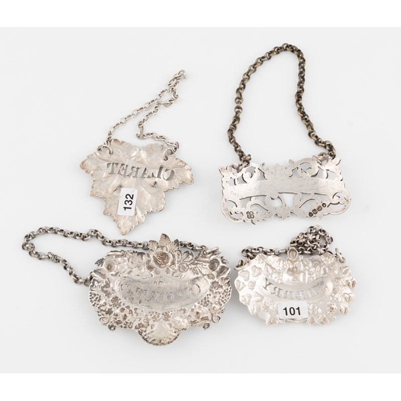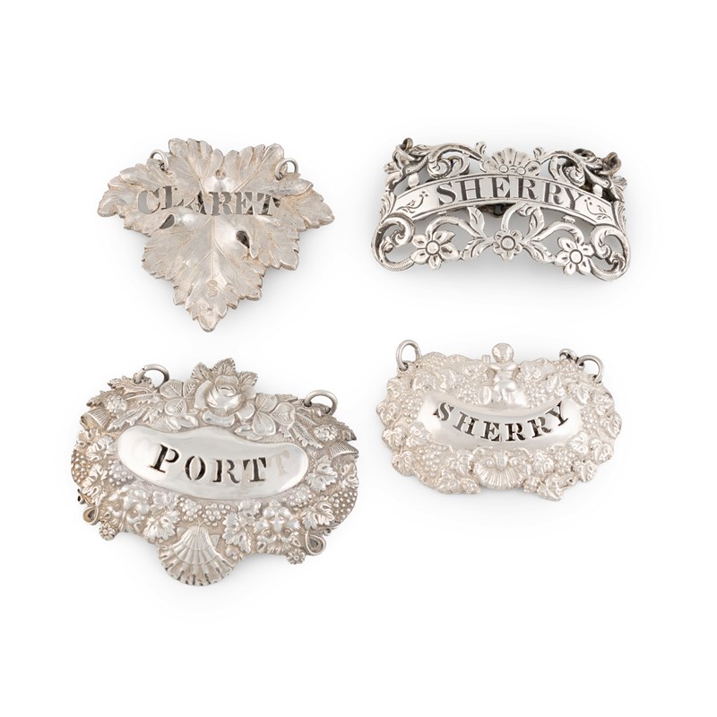 comprising: one by Reily & Storer, London circa 1840, of leaf form, pierced 'Claret', one by Rawlings & Summers, London 1836, pierced scroll foliate form, incised 'Sherry', one with pierced maker's mark, London 1827, vine and grape decoration, pierced 'Sherry', and one with a worn maker's mark, London 1822, pierced 'Port' over an erased title, approx. weight 1.9oz. (4)