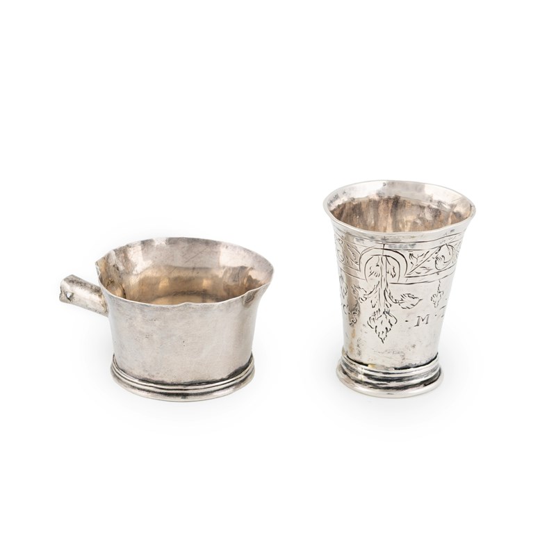 tapering circular form, engraved decoration, scratch initialled 'M.T', height 3.7cm, plus a miniature silver brandy pan, maker's mark possibly IC, tapering circular form, no handle, approx. total weight 0.7oz. (2)