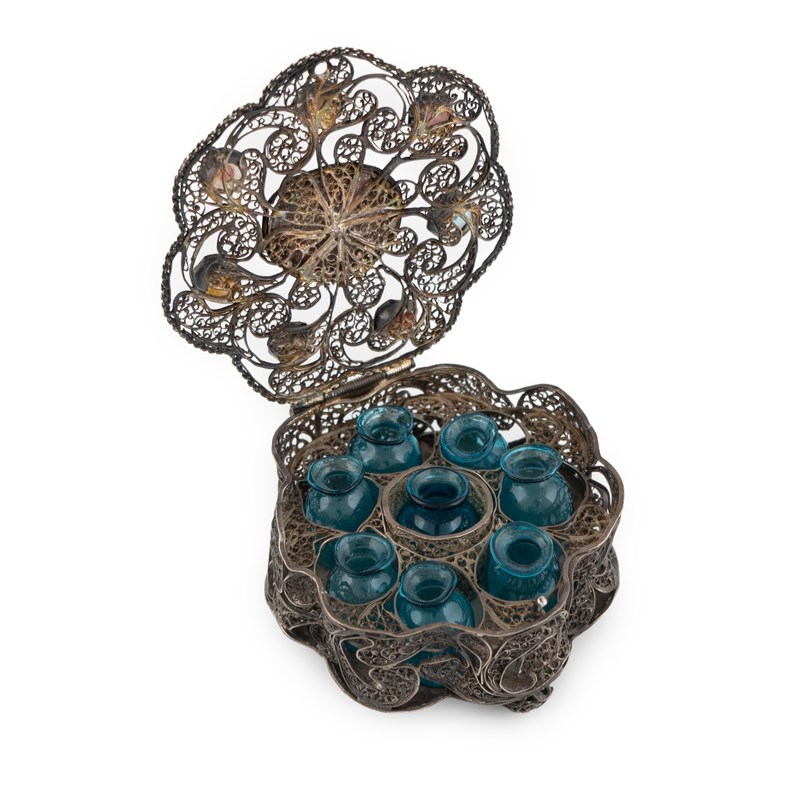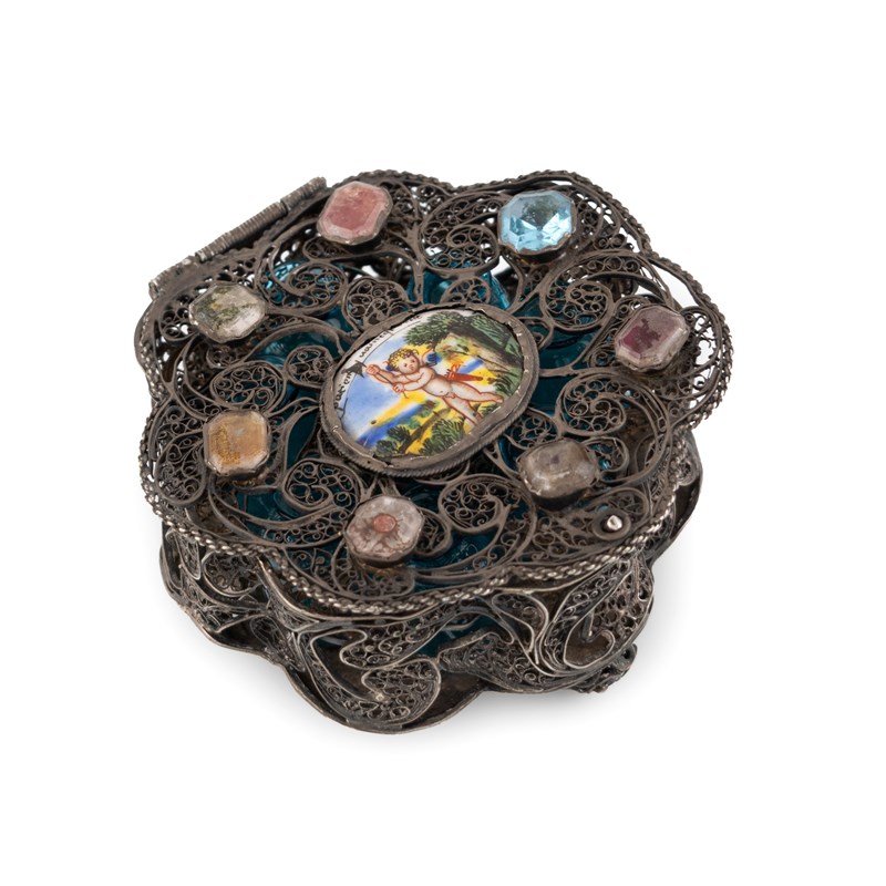 scalloped circular form, scroll filigree decoration, the cover set with an enamel plaque of a cherub with seven coloured cabochons surrounding, to the interior eight turquoise glass scent bottles, on three filigree feet, length 6.8cm.