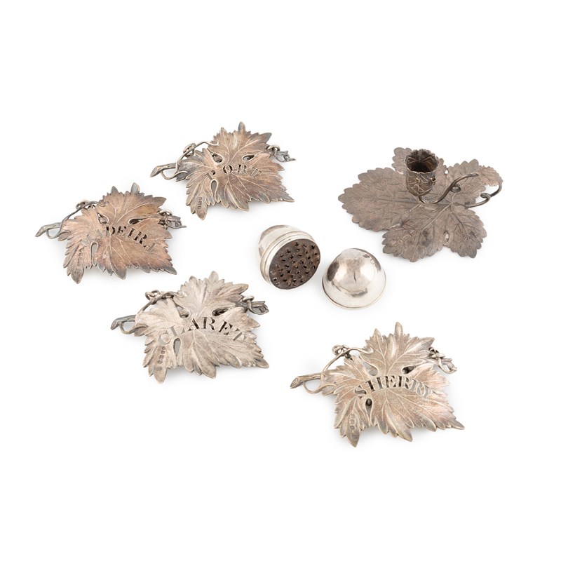 the other by Charles Rawlings London 1824, vine leaf form, pierced 'Claret', 'Madeira', 'Port', and 'Sherry', plus a chamberstick and egg nutmeg grater, total approx. weight 5oz. (6)