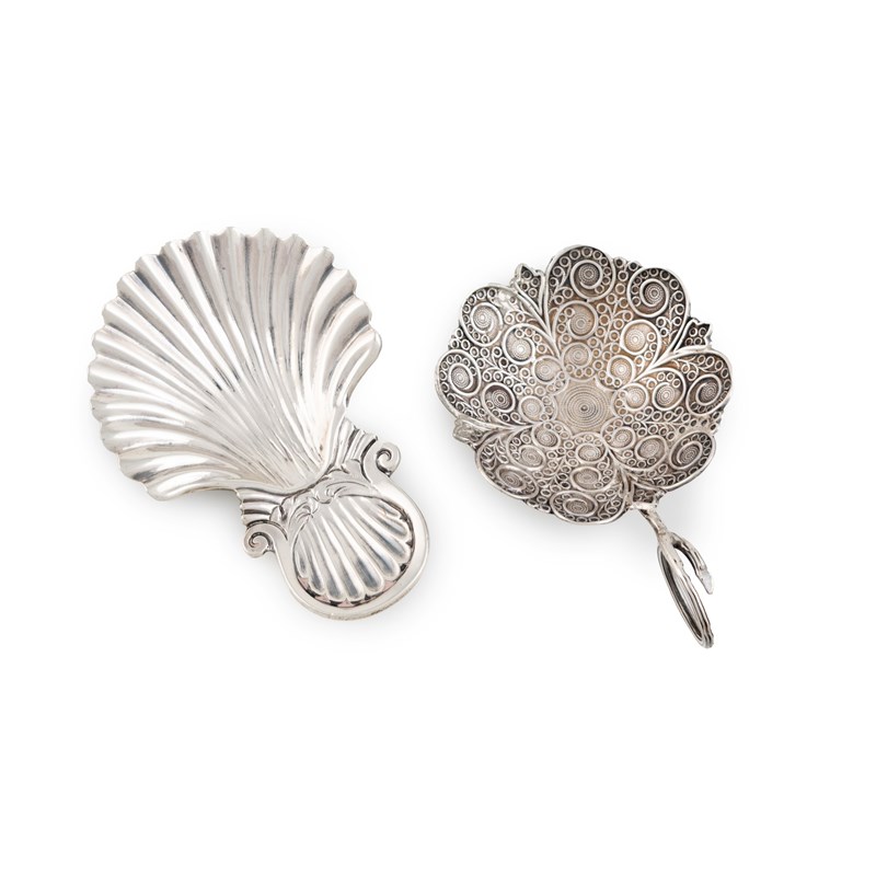 scallop shell form with textured decoration, plus an unmarked filigree caddy spoon, total approx. weight 1.5oz. (2)