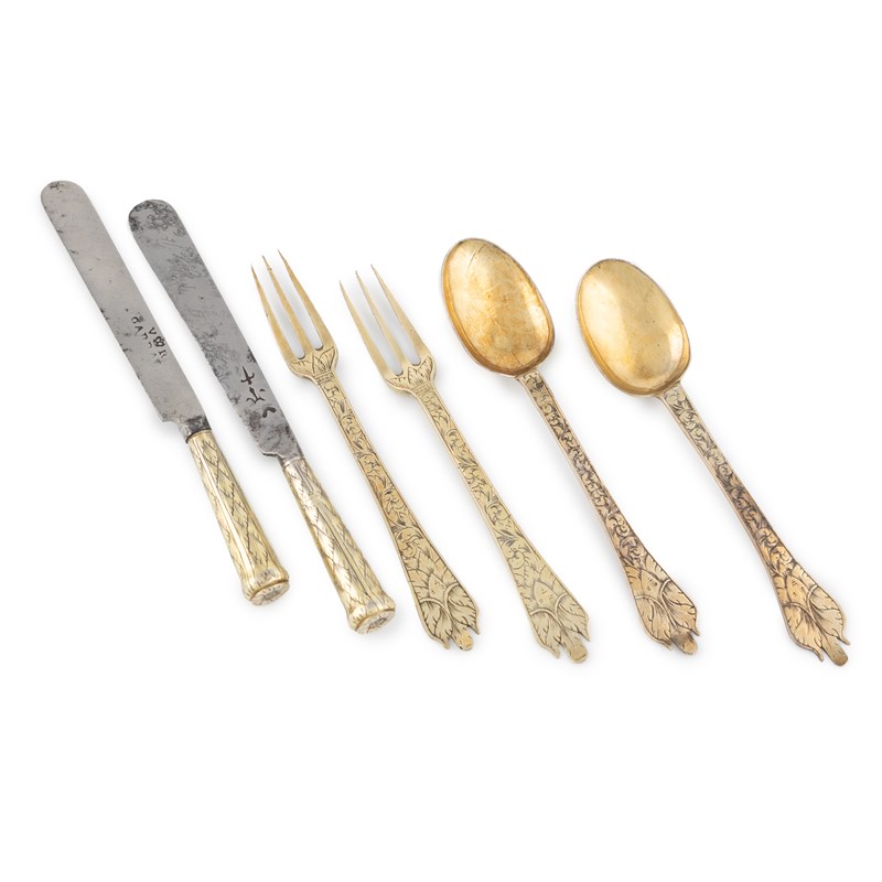 Two sets of William & Mary silver-gilt Trefid sweetmeats/children's knives, forks and spoons,