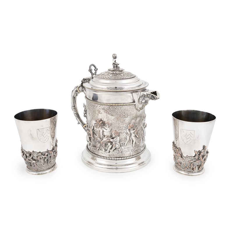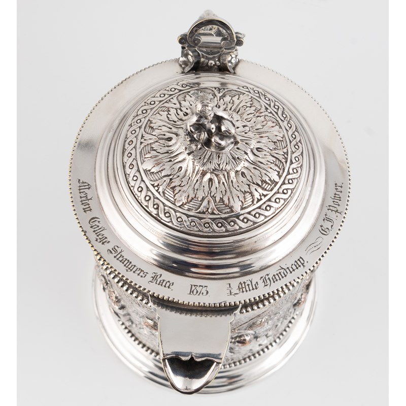 circular form with a relief scene of putto around rams and a reclining Bacchus, acanthus leaf capped scroll handle with ivory insulators, the cover inscribed 'Merton College Strangers Race 1873 1/4 mile handicap G.F.Power' with a putti finial, height 23cm, the beakers of circular tapering form with relief rural scenes with figures dancing, engraved with crests. (3)