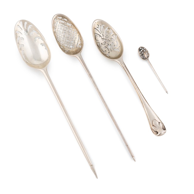 A collection of four 18th century silver mote spoons,comprising: a George I miniature mote spoon,