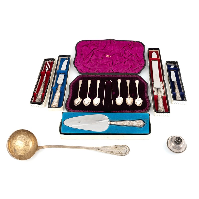 comprising: a cased set of Victorian Scottish silver teaspoons and sugar tongs by R & W Sorley, Glasgow 1892, a kettle stand burner, a German silver ladle, a cheese knife, a cake slice, a pickle fork, a bread knife and a carving knife, total approx. weighable 14.2oz. (qty)