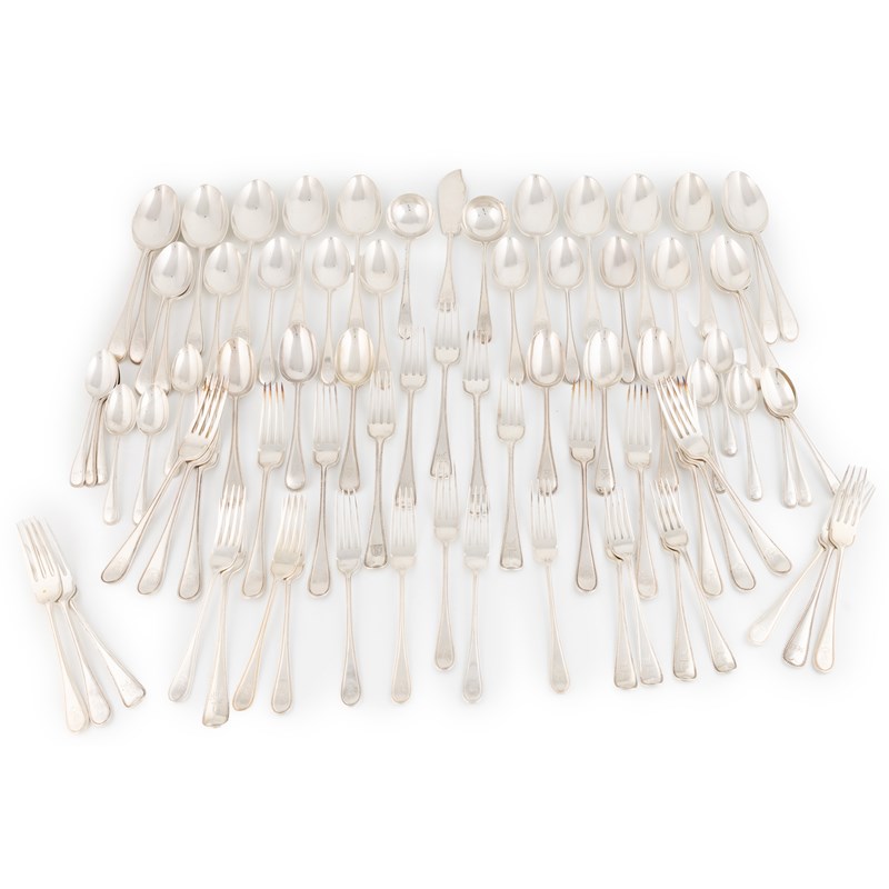 engraved with crests and initials, comprising: twelve tablespoons, fifteen table forks, nineteen dessert forks, eighteen dessert spoons, twelve teaspoons, a pair of sauce ladles and a fish knife, total approx. weight 147.7oz. (qty)
