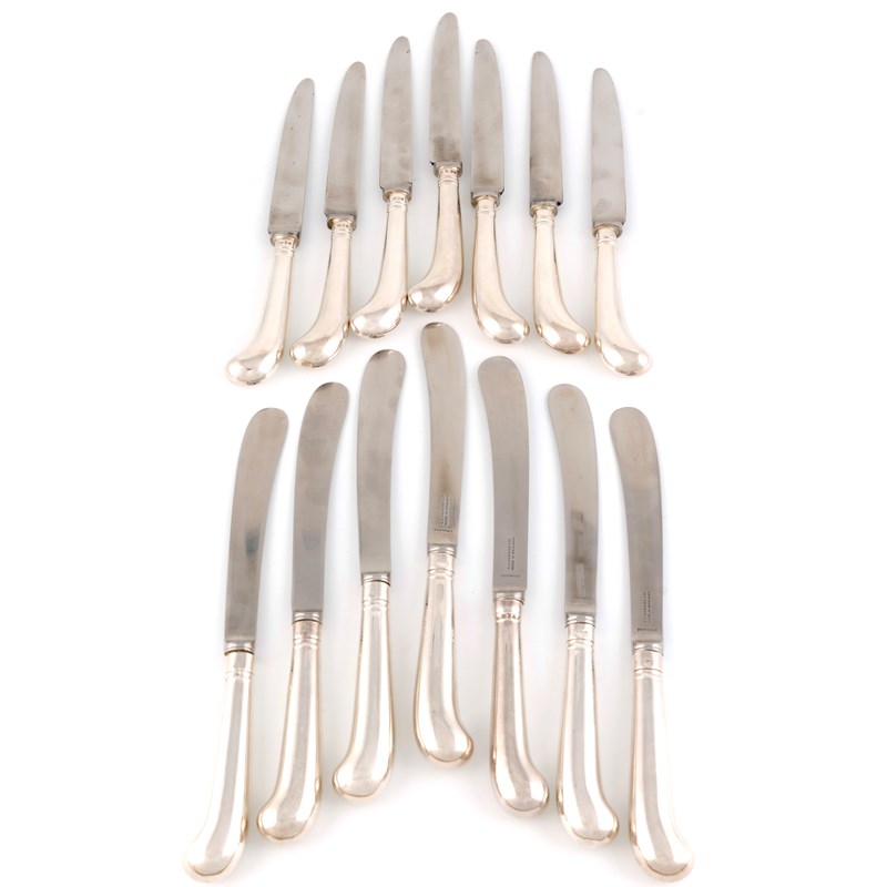 the table knives by Goldsmiths & Silversmiths Co Ltd., London 1899, with stainless steel blades, length 25cm. (14)
