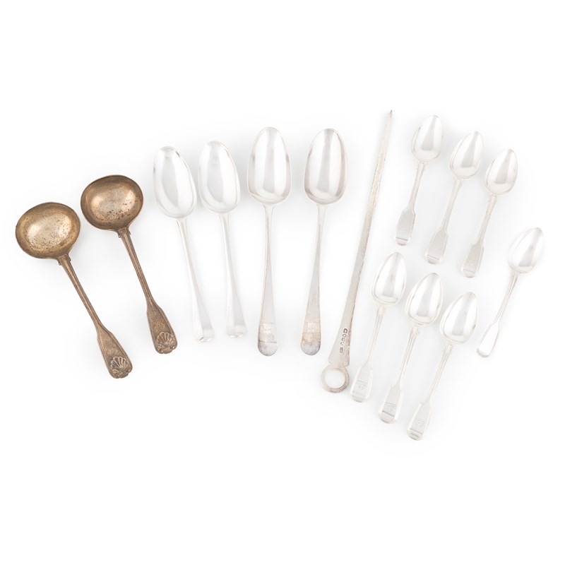 comprising: a pair of George I silver Hanoverian tablespoons by Henry Clarke, London 1718, plus a set of six George IV silver Fiddle and Thread pattern teaspoons by Sarah & John Blake, London 1822, plus another similar, a pair of sauce ladles, a pair of tablespoons and a meat skewer, total approx. weight 25.5oz. (qty)