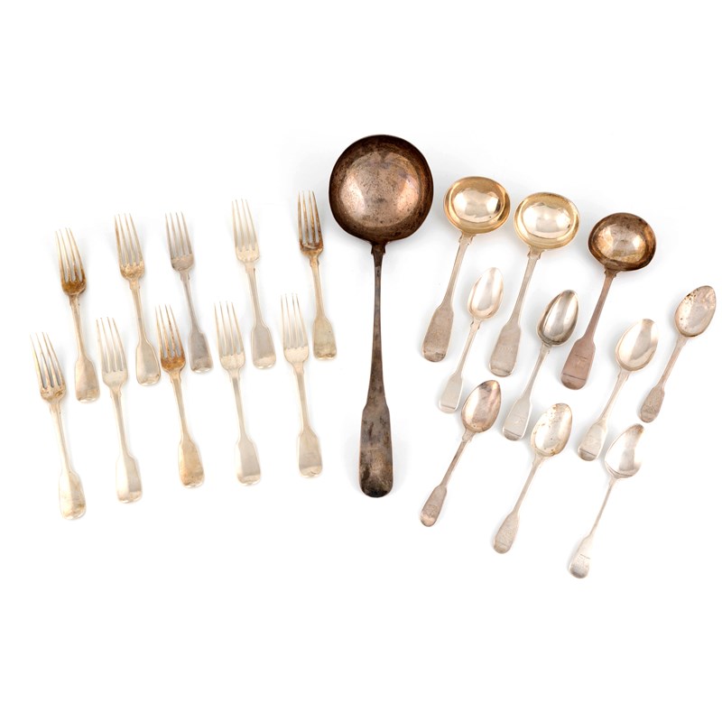 comprising: a soup ladle, three sauce ladles, ten dessert forks and seven teaspoons, total approx. weight 32.7oz. (qty)