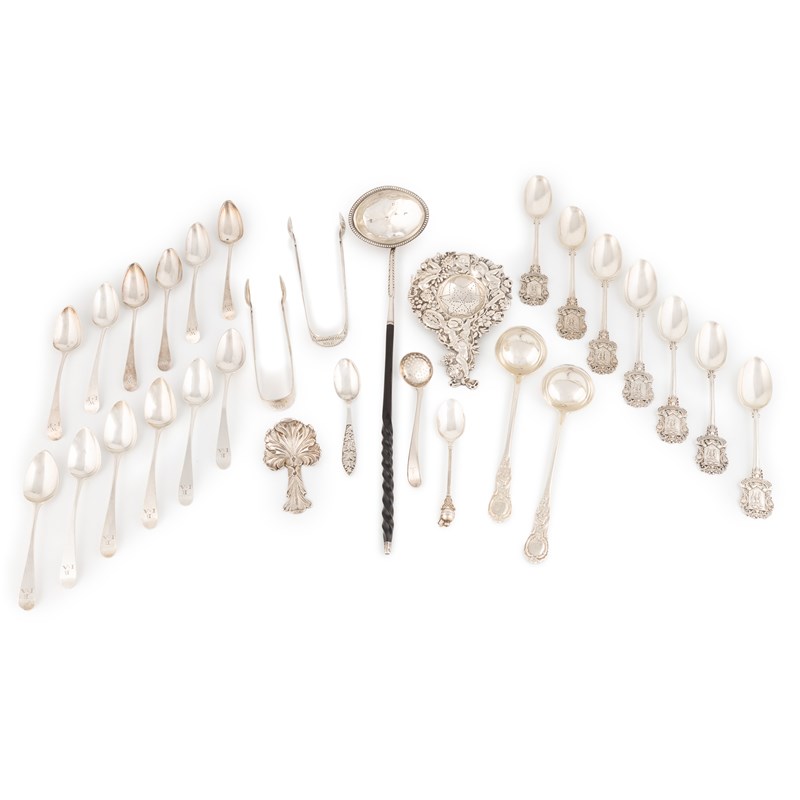 comprising: a set of six armorial teaspoons by Elkington & Co Ltd, Birmingham 1912, plus another similar, a Victorian silver caddy spoon by John Tongue, Birmingham 1839, of leaf form, plus fourteen other teaspoons, two pairs of sugar tongs, a pair of sauce ladles, a sugar sifter, a tea strainer and a toddy ladle, total approx. weighable 22.9oz. (qty)