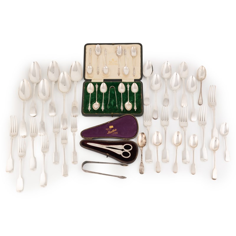 comprising: a cased pair of late-Victorian silver scissors by Wakely & Wheeler, London 1896, six table forks, six dessert forks, six tablespoons, six dessert spoons, thirteen teaspoons, a pair of sugar tongs and a cased set of six teaspoons and sugar tongs, total approx. weight 53.1oz. (qty)