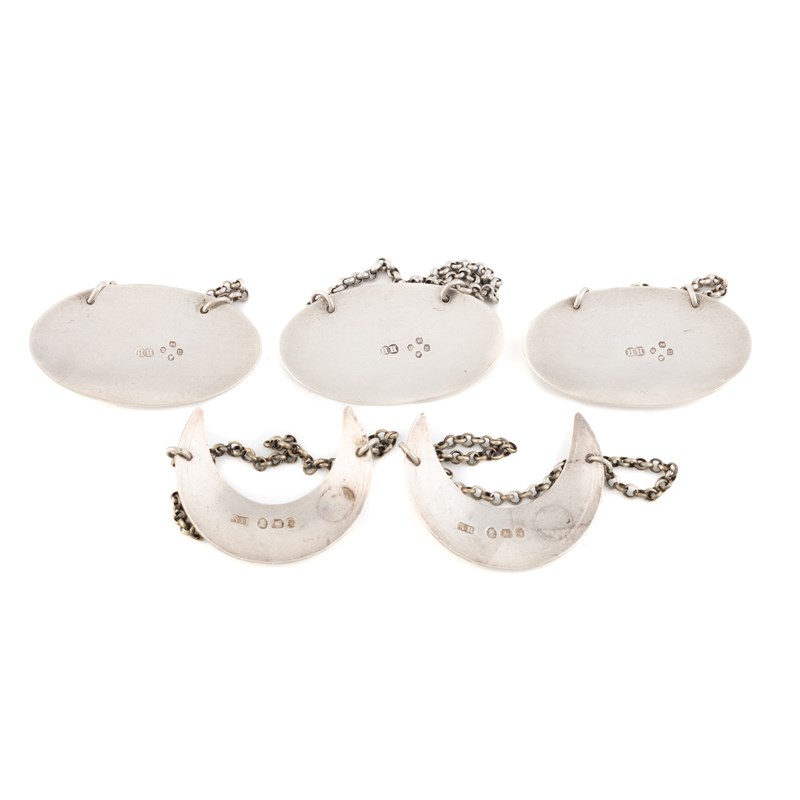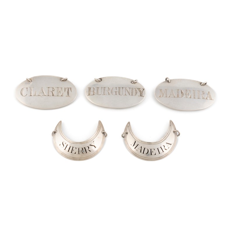 plain oval form, incised 'Claret', 'Burgundy' and 'Madeira', length 5.3cm, plus a pair by Susannah Barker, London 1791, crescent form incised 'Madeira' and 'Sherry', total approx. weight 1.7oz. (5)