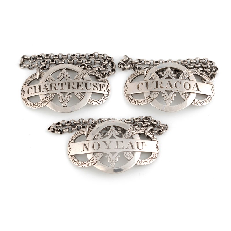 three interlaced circles with engraved scroll foliate decoration, incised 'Chartreuse', 'Curacoa' and 'Noyeau', length 4.8cm, total approx. weight 1.4oz. (3)