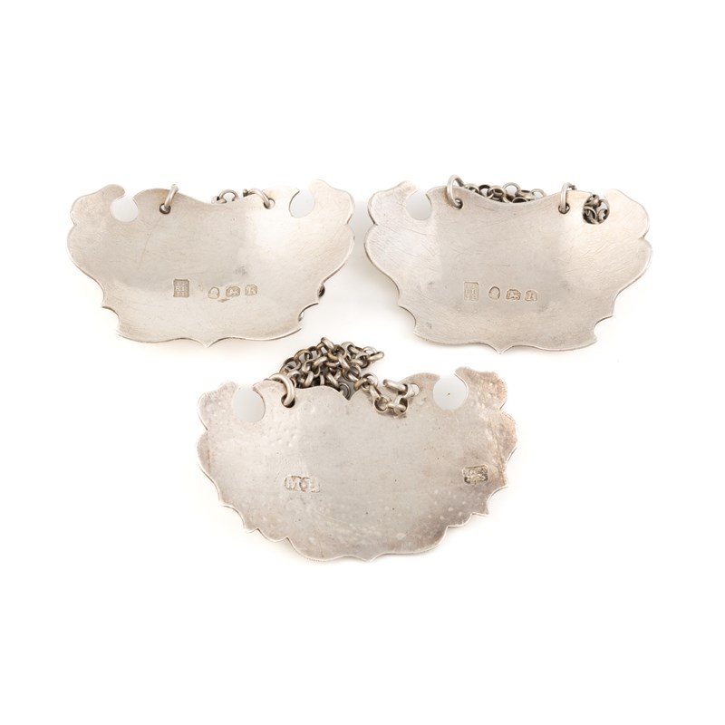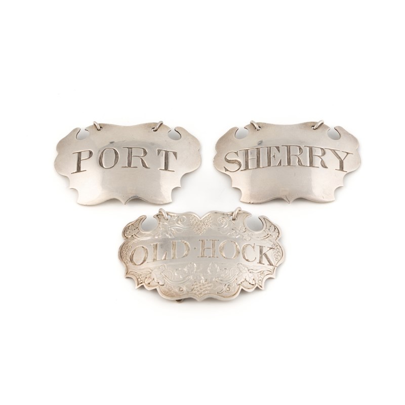 escutcheon form, incised 'Sherry' and 'Port', length 5.2cm, plus a George III silver wine label by Margaret Binley, London circa 1760, incised 'Old Hock', total approx. weight 1.3oz. (3)