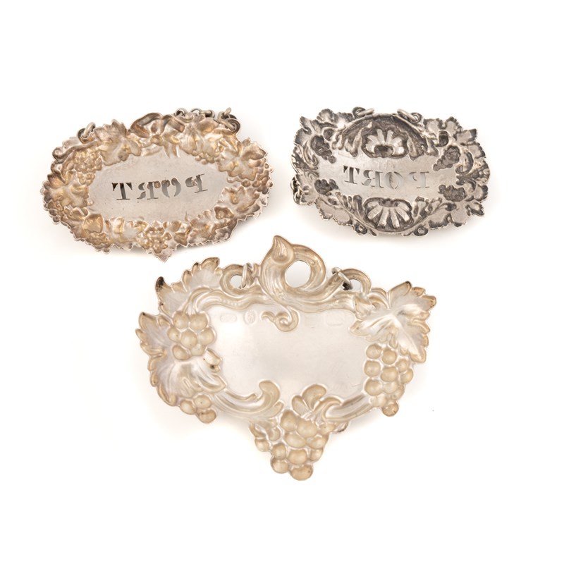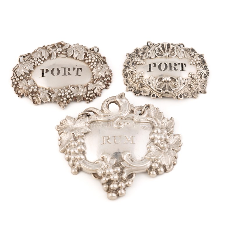 shaped oval form with grape and vine decoration, incised 'Rum', length 7.8cm, plus a label by Reily & Storer, London 1839, pierced 'Port', and one possibly by William Bateman, London 1826, pierced 'Port', total approx. weight 2oz. (3)