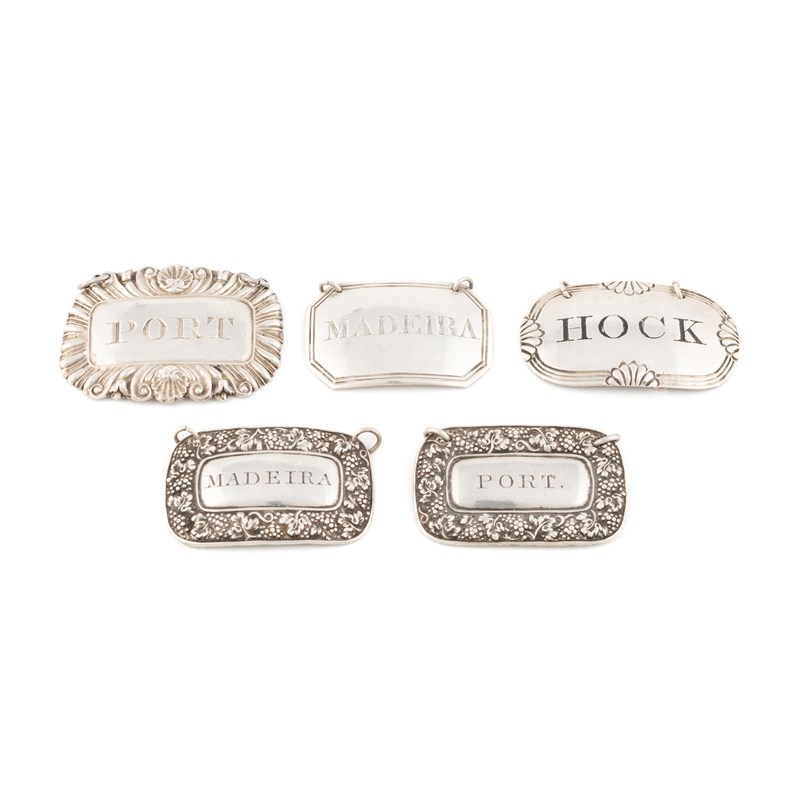 comprising: a pair by Joseph Taylor, Birmingham 1824, incised 'Port' and 'Madeira', one by Charles Rawlings, London 1818, incised 'Hock', one by William Knight, London 1836, incised 'Hock' and one by John Mitchell, Glasgow 1824, incised 'Madeira', total approx. weight 1.6oz. (5)