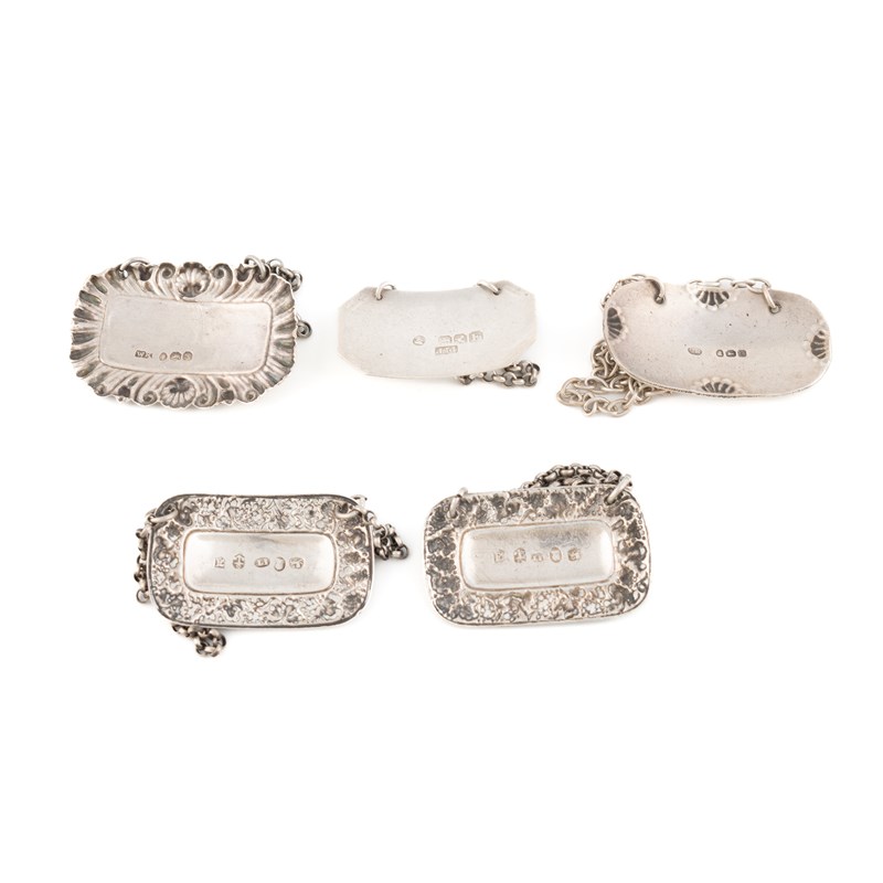 A collection of antique silver wine labels,